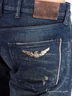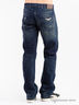 Модные джинсы прямого кроя выполнены из хлопка. Модель дополнена застежкой на пуговицу и молнию. По бокам - втачные карманы, сзади - накладные. Изделие декорировано эффектом потертости.