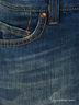 Детали: отрезной пояс со шлевками для ремня, застежка на металлические пуговицы, два прорезных кармана спереди, два накладных сзади, прямые брючины, модель декорирована потертостями.