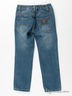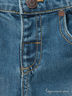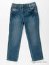 Джинсы прямого силуэта с застежкой на пуговицу и молнию. Отрезной пояс с вшитой резинкой и пришитыми шлевками. Три передних кармана, два задних кармана. Эффект потертости.