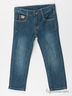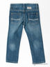 Джинсы прямого силуэта с застежкой на пуговицу и молнию. Отрезной пояс с внутренней регулирующей резинкой и пришитыми шлевками. Три передних кармана, два задних кармана. Эффект потертости.