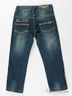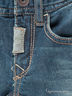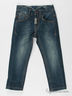Джинсы прямого силуэта с застежкой на пуговицу и молнию. Отрезной пояс с внутренней регулирующей резинкой и пришитыми шлевками. Три передних кармана, два задних кармана. Эффект потертости.