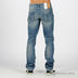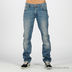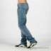 Джинсы мужские синего цвета. Классический крой с пятью карманами. Прямой силуэт. Отрезной пояс со шлевками для ремня. Застежка на пуговицы. Декоративная прострочка контрастного цвета.