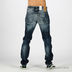 Джинсы мужские синего цвета. Классический крой с пятью карманами. Слегка зауженный к низу силуэт. Отрезной пояс со шлевками для ремня. Застежка на пуговицы. Декоративная прострочка контрастного цвета.