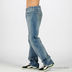 Джинсы мужские синего цвета. Классический крой с пятью карманами. Прямой силуэт. Отрезной пояс со шлевками для ремня. Застежка на пуговицы. Декоративная прострочка контрастного цвета.