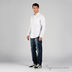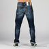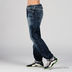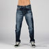 Джинсы мужские синего цвета. Классический крой с пятью карманами. Прямой силуэт. Отрезной пояс со шлевками для ремня. Застежка на пуговицы. Декоративная прострочка контрастного цвета.