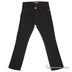 Джинсы из тонкой ткани. Широкий пояс и шлевки для ремня, застежка на молнии и на пуговице, два прорезных кармашка.