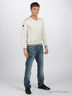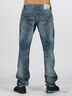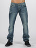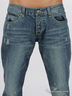 Мужские джинсы прямого покроя синего цвета с эффектом потертости. Отрезной пояс. Есть шлевки для ремня. Застегиваются на молнию и пуговицу. Пять карманов. Сзади прямоугольная кокетка.