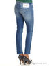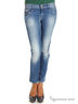 Детали: отрезной пояс со шлевками для ремня, два прорезных кармана спереди, два накладных сзади, прямые укороченные брючины, модель декорирована потертостями и рваностью на колене.