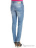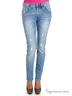 Детали: отрезной пояс со шлевками для ремня, два прорезных кармана спереди, два накладных сзади, модель декорирована потертостями.