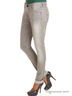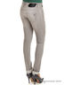 Детали: отрезной пояс со шлевками для ремня, застежка на пуговицу и молнию, два прорезных кармана спереди, два накладных сзади, зауженные брючины с отворотами.