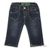 Джинсы с потертостями, хольнитенами и необычной формой карманов. Застежка на молнию и на пуговицу, втачной пояс со шлевками для ремня.