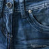 Джинсы для девочки синего цвета. Выполнены из хлопковой ткани с небольшим добавлением эластана. Классическая 5-карманная модель, прямого кроя. Окрас с искусственными потертостями и складками (эффект крэш). Застегиваются на молнию, пояс на пуговице. Шлевки для ремня. Сзади оригинальные двойные карманы, украшенные стразами. Декоративная отстрочка люрексовой нитью серебряного цвета.