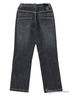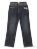 Темные джинсы прямого фасона с небольшими потертостями. Застежка на молнию и пуговицу. Декоративная прострочка контрастными нитками. Изделие украшено яркими значками. Отличный вариант для маленького модника.