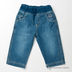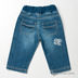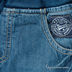 Модель прямого кроя. В широкий трикотажный пояс вшита резинка и вставлен шнурок. Три передних кармана. Имитация задних карманов, имитация застежки на молнию. Декоративная нашивка спереди, нашивка на правой штанине сзади.
