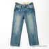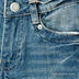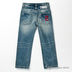 Модель прямого кроя застегивается на крючок и молнию. К поясу пришиты петли для ремня. Три передних кармана, два задних кармана. Декоративная вышивка и аппликация сзади.