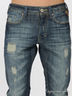 Джинсы мужские прямого кроя. Классические пять карманов. Отрезной пояс со шлевками для ремня. Застежка на пуговицу и молнию. Декоративные потертости и дырки с прострочкой.