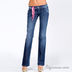 Стильные прямые джинсы в классическом стиле. Четыре кармана, втачной пояс и шлевки под ремень, застежка на молнии и на пуговице, низкая талия, брючины прямые по всей длине. Искусственные затертости и помятости. Сзади ряд разноцветных декоративных клепок.