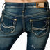 Стильные джинсы от Fracomina из хлопковой ткани. Классические "пять карманов" прямого покроя, декорированные искусственными потертостями и замятостями. Очень низкая посадка на бедрах. Шлевки под ремень. Сзади на шлевках логотип производителя. Карманы украшены декоративными вышитыми элементами.