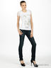 Детали: отрезной пояс со шлевками, треугольная кокетка, застегивается на металлическую молнию и пуговицы, 5 карманов, украшены стразами