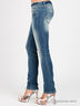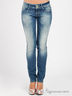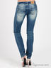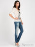 Детали: широкий втачной пояс и шлевки для ремня, застежка на молнии и на пуговице, пять карманов с оригинальными клепками с вставкой из страз, что придает изделию особенный вид, джинсы вытерты, небольшие потертости, брючины заужены к низу.