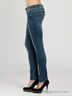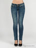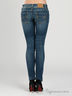 Женские джинсы "скинни" синего цвета из денима с небольшим эффектом потертости. Широкий отрезной пояс. Есть шлевки для ремня. Застегиваются на молнию и пуговицу. Пять карманов. Сзади прямоугольная кокетка. Декорированы контрастной прострочкой и крупными стразами.
