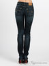 Женские джинсы "скинни" темно-синего цвета из денима с эффектом потертости. Отрезной пояс. Есть шлевки для ремня. Застегиваются на молнию и пуговицу. Пять карманов. Декорированы контрастной прострочкой.