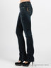Женские джинсы "скинни" темно-синего цвета из денима с эффектом потертости. Отрезной пояс. Есть шлевки для ремня. Застегиваются на молнию и пуговицу. Пять карманов. Декорированы контрастной прострочкой.