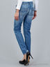 Джинсы зауженного к низу кроя с эффектом потертости. Втачные карманы спереди и накладные с клапаном сзади. Застежка на молнию и пуговицу.