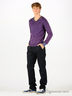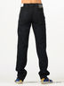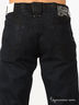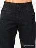 Слегка зауженные джинсы темно-синего цвета. Отрезной пояс, есть шлевки. Застегиваются на болты. Спереди два втачных кармана, один маленький прорезной, сзади два накладных. Декорированы вставками из черной джинсы.