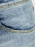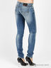 Классические джинсы из плотного, мягкого денима. Отрезной пояс со шлевками для ремня. Застежка на пуговицу и молнию. Спереди два прорезных кармана и один декоративный накладной, сзади два накладных. Длинные зауженные брючины. Джинсы декорированы потертостями на брючинах и на краях деталей.