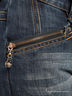 Модель прямого кроя застегивается на пуговицу и молнию. К поясу пришиты шлевки. Множество карманов. Эффект потертости.