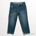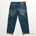 Модель прямого кроя застегивается на кнопку и молнию. К поясу пришиты шлевки. Три передних кармана, два задних кармана. Эффект потертости.
