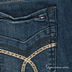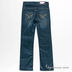 Модель прямого кроя застегивается на пуговицу и молнию. К поясу пришиты шлевки. Три передних кармана, два задних кармана. Эффект "потертости", декоративная вышивка на задних карманах.