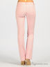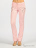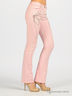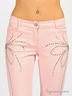 Слегка расклешенные от колена джинсы. Отрезной пояс. есть шлевки для ремня. Застегиваются на молнию и пуговицу. Пять карманов. Сзади треугольная кокетка. Декорированы бисером и пайетками.