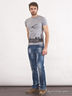 Потрясающие джинсы из хлопкового денима. Отрезной пояс со шлевками для ремня. Застежка на пуговицу и молнию. Спереди два прорезных кармана и один накладной, сзади два накладных кармана. Длинные зауженные брючины. Джинсы декорированы потертостями.