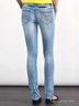 Детали: отрезной пояс со шлевками для ремня, застежка на пуговицу и молнию, два прорезных кармана спереди, два накладных сзади, модель декорирована вышивкой