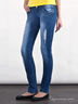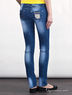 Детали: отрезной пояс со шлевками для ремня, застежка на пуговицу и молнию, два прорезных кармана спереди, два накладных сзади, модель декорирована потертостями, стразами
