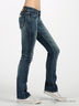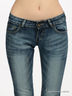 Классические пятикарманные джинсы с потертостями. Застегиваются на молнию и пуговицу. Треугольная кокетка. Украшены контрастной прострочкой.