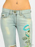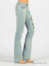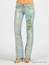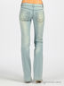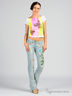 Джинсы прямого покроя. Отрезной пояс, есть шлевки для ремня. Застегиваются на молнию и пуговицу. пять карманов, маленький с клапаном на пуговице. Декорированы потертостями, вышивкой и пайетками.