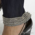 Женские темно-синие джинсы с декором по низу брюк. Низ джинс оформлен сверкающими кристаллами, что придает своеобразный шик классическим джинсам. Зауженный к низу силуэт, посадка на бедрах. Искусственные замятости.