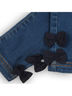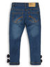 Джинсы прямого кроя с застежкой на молнию и пуговицу. По бокам карманы. По низу бантики.