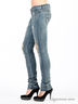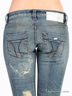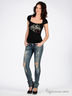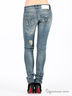 Зауженные джинсы темно-синего цвета с потертостями и декоративными дырками. Заношенные, потертые джинсы остаются в моде. Отрезной пояс. Есть шлевки для ремня. Застегиваются на молнию и пуговицу. Пять карманов. Сзади треугольная кокетка. Сексуальные и стильные, модель для современных ярких женщин.