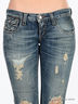 Зауженные джинсы темно-синего цвета с потертостями и декоративными дырками. Заношенные, потертые джинсы остаются в моде. Отрезной пояс. Есть шлевки для ремня. Застегиваются на молнию и пуговицу. Пять карманов. Сзади треугольная кокетка. Сексуальные и стильные, модель для современных ярких женщин.