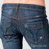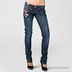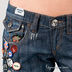 Стильные джинсы, зауженные к низу. Джинсы имеют пять карманов и искуственные потертости. Спереди джинсы украшены значками.