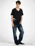 Классические мужские джинсы. Отрезной пояс, есть шлевки для ремня. Пять карманов. Застегиваются на молнию и пуговицу. Декорированы цветной прострочкой и потертостями.