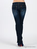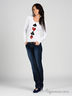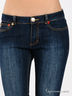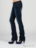 Женские джинсы прямого покроя. Отрезной пояс. Есть шлевки для ремня. Пять карманов. Застегиваются на молнию и пуговицу. Декорированы контрастной прострочкой.