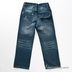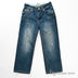 Зауженная модель застегивается на молнию и застежку-крючок. К поясу пришиты петли для ремня. Три передних кармана, два задних кармана, один из них на кнопке. Над левым задним карманом декоративная вышивка.