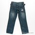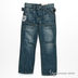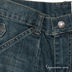 Детали: в пояс вставлена регулирующаяся резинка, застежка на пуговицу и молнию, к поясу пришиты шлевки, два передних кармана, два задних кармана, ремешки по боковым швам, эффект потертости, анатомический крой колен