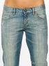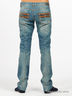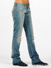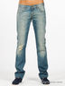 Классические джинсы прямого кроя, с эффектом винтажа. Застегиваются спереди на молнию и пуговицу. Пять карманов. Задние карманы декорированы хлястиками с пряжками. Плотная неэластичная ткань. Сзади простроченные стрелки.