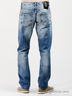 Детали: отрезной пояс со шлевками для ремня, застежка на пуговицу и молнию, два прорезных кармана спереди, два накладных сзади, модель декорирована потертостями и металлическими черепами.